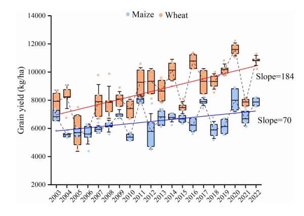 禹城站综合观测场冬小麦和夏玉米产量变化(2003-2022)